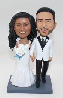 We offer Custom Cake topper for a few of years and we know more about bobblehead cake toppers than anyone. Over 150 styles are offered in this category. Most are best-selling and popular with customers. We have a lot of standard wedding styles with bride wearing dress and groom in suit standing or sitting by each other, holding hands or groom carrying bride.Though more couples prefer to customize a stylish cake topper, a few of couples insist on buying standard bobbleheads to put on the cake. There are also cake toppers with different themes, including indian or canadan wedding cake topper,sports style, japanes and chinese style and musician styles. You can choose the one best suits your clothes you wear on your wedding day and add the accessories like flower, pets, ties,personalized bases and any other options. You can also select the one shows the right occupation of you or the hobby of you and that must be a meaningful option. Bobblehead cake topper, the bobble head feature is so good for a top of cake as the heads is usually bigger on the bodies than normal and that seems both stylish, fun and fashionable. Cake topper is really one of the most important part of the wedding. Everyone would like their bobblehead topper to become the hit of the day. And we will help you realize your wish. What you need to do is trust us and specify your requirement and we will do the rest.